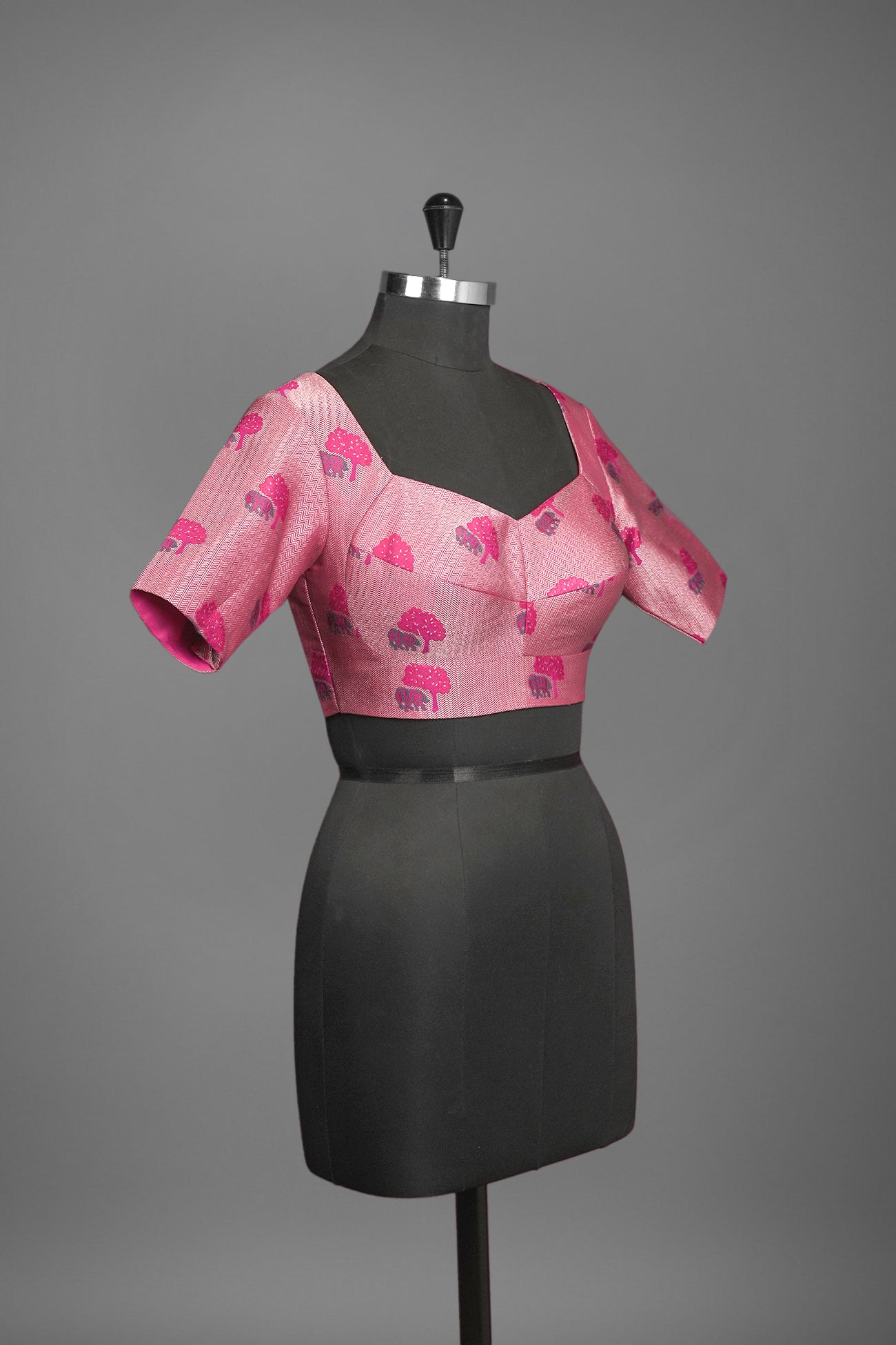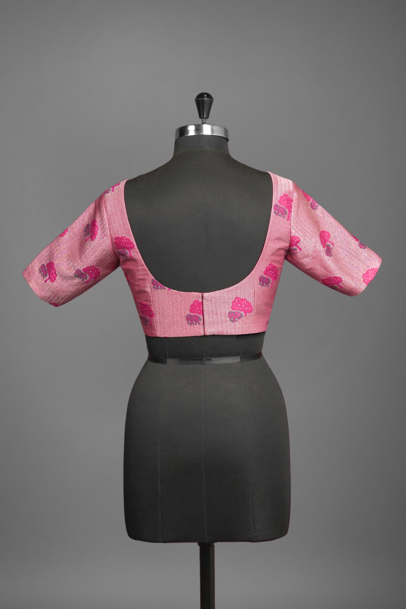 Festive wear pretty fuschia pink single color blended silk brocade body designed elephant blouse ready to wear with half fine zari silver