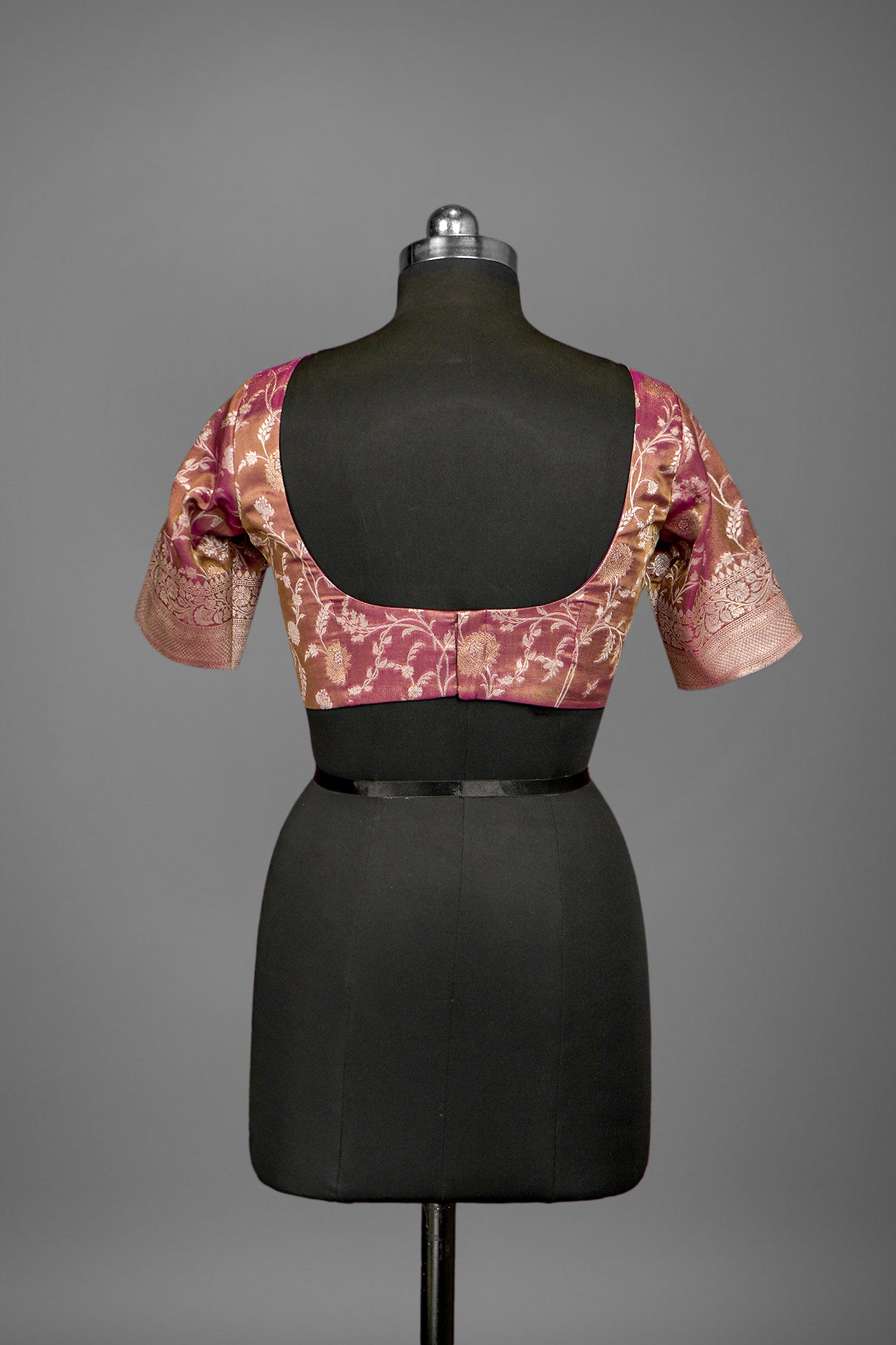 Festive wear pretty purple violet short colour blended tissue woven body designed blouse ready to wear with half fine zari gold
