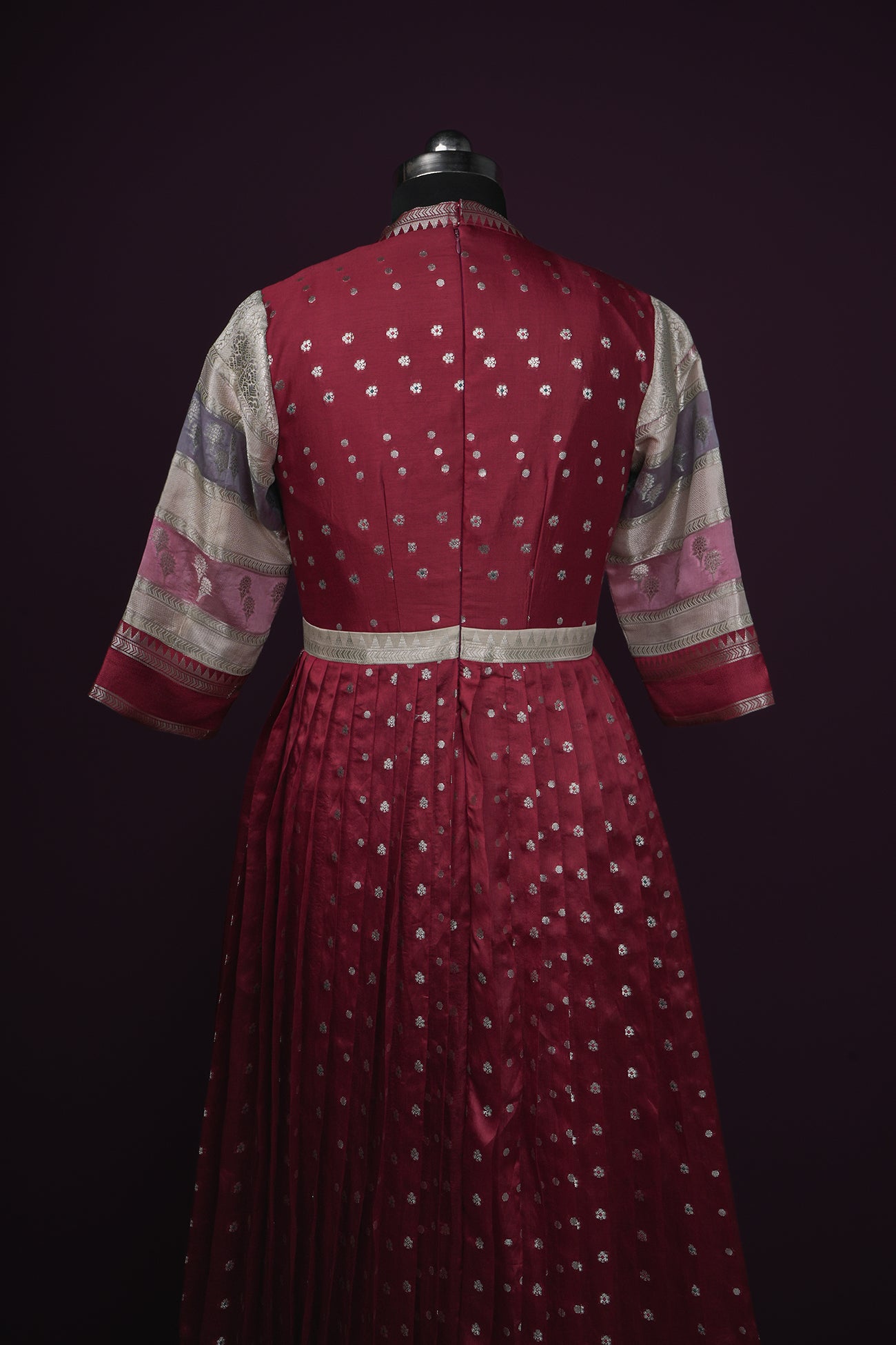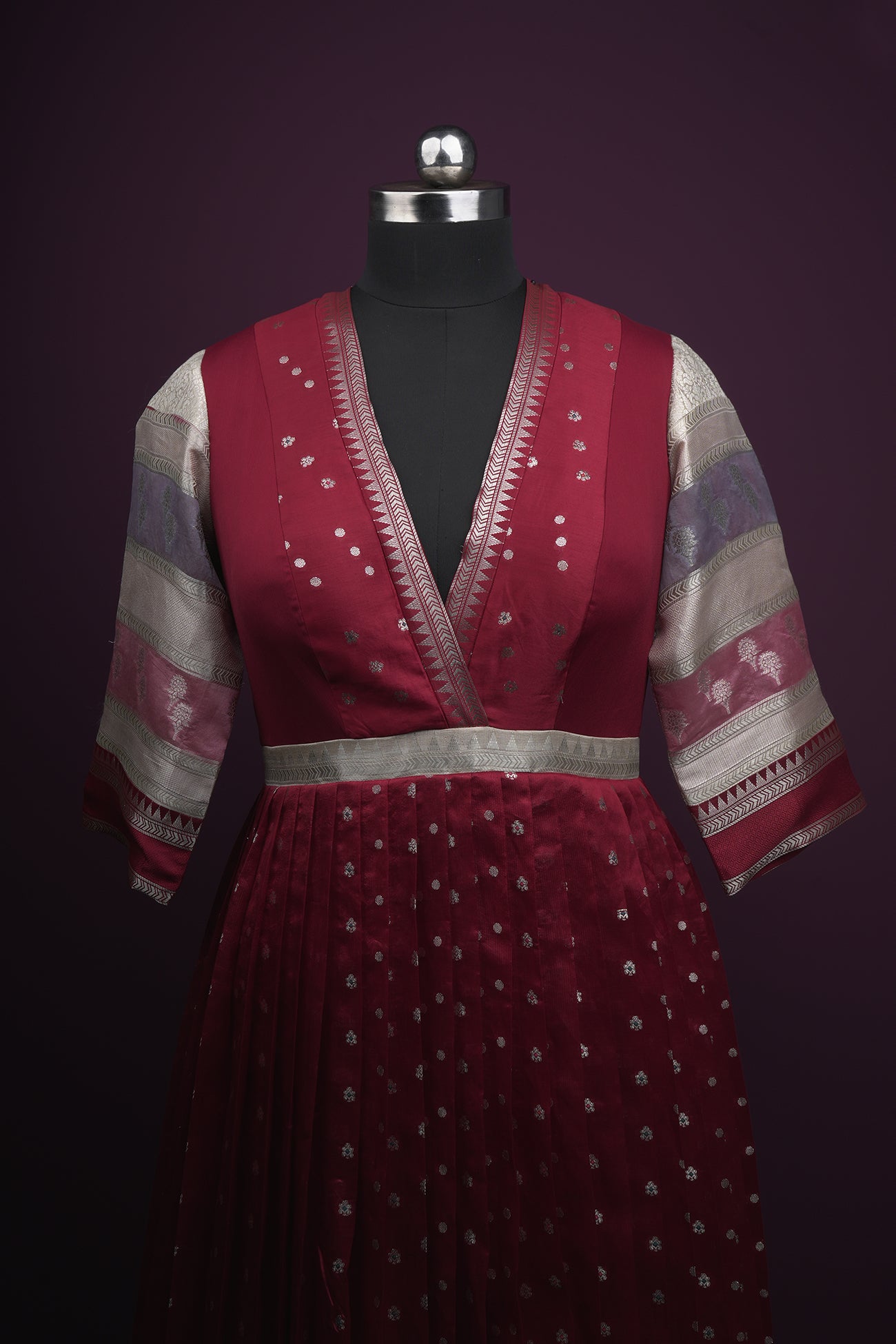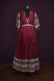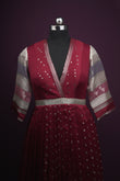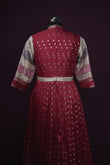 Festive wear traditional blood red single color blended khatan silk woven body designed border hand embroidery Anarkali top with sequins half fine zari gold jari