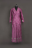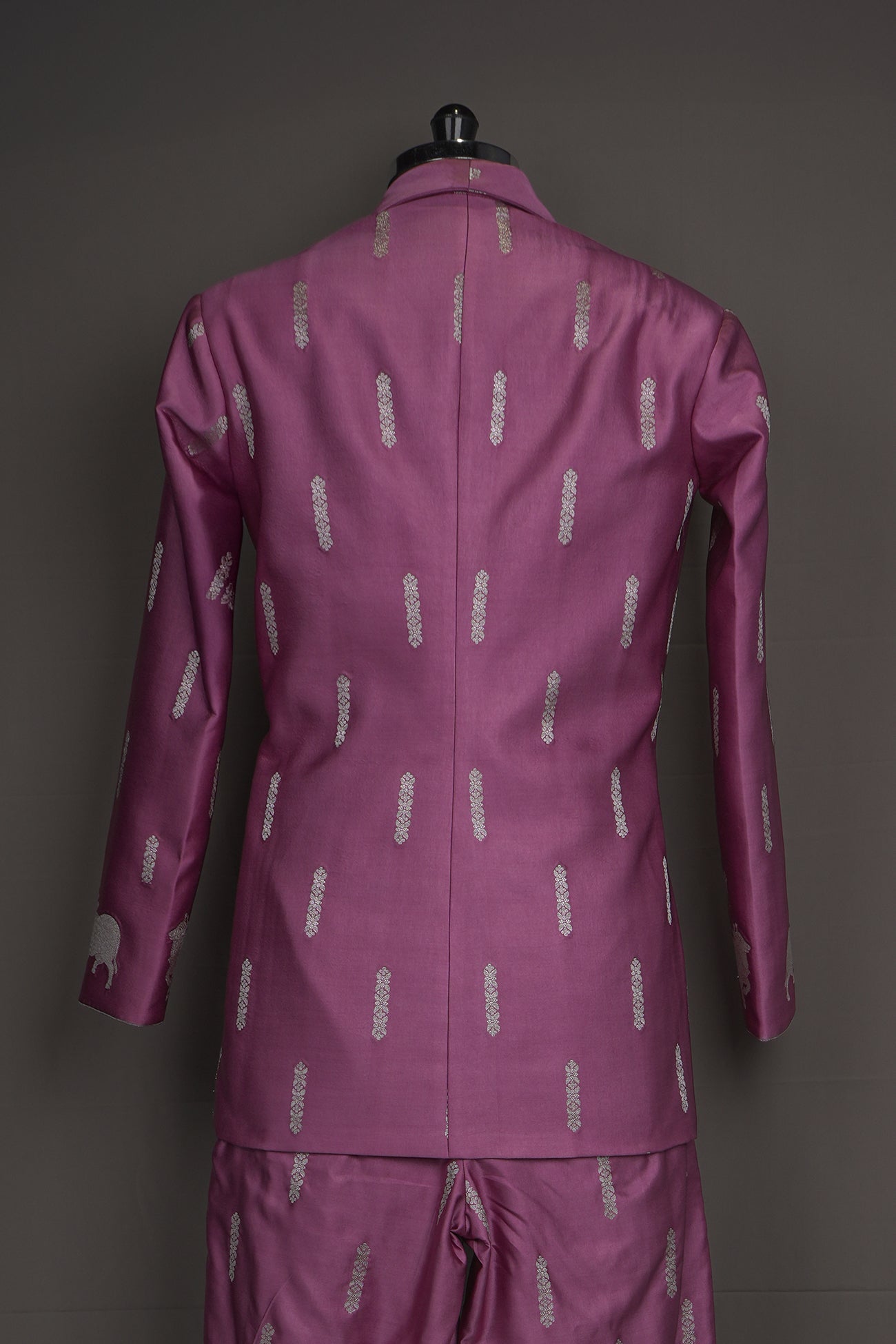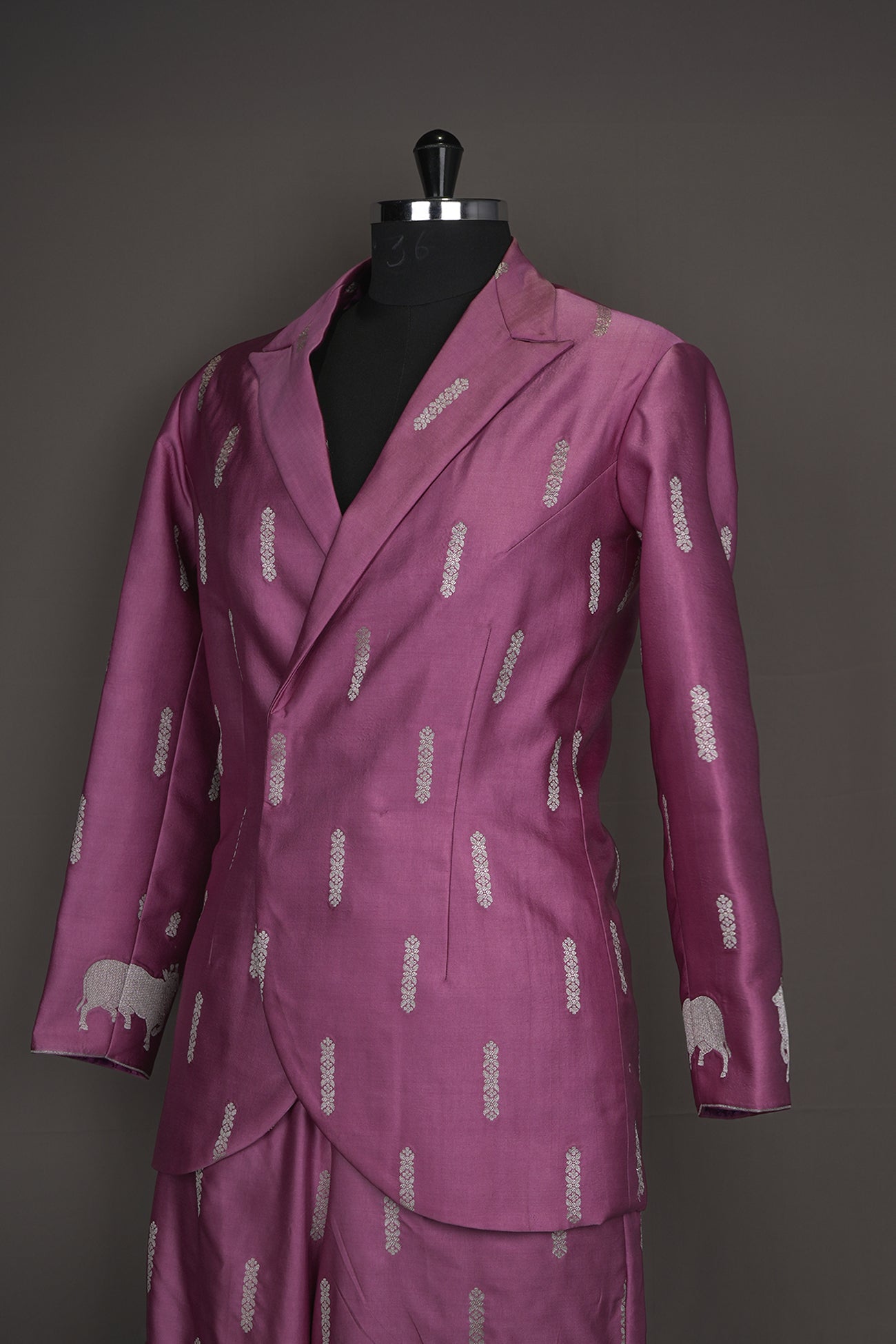 Festive wear pretty magenta pink single color blended satin woven animal body designed border Indo-westerns with half fine zari gold half fine zari silver