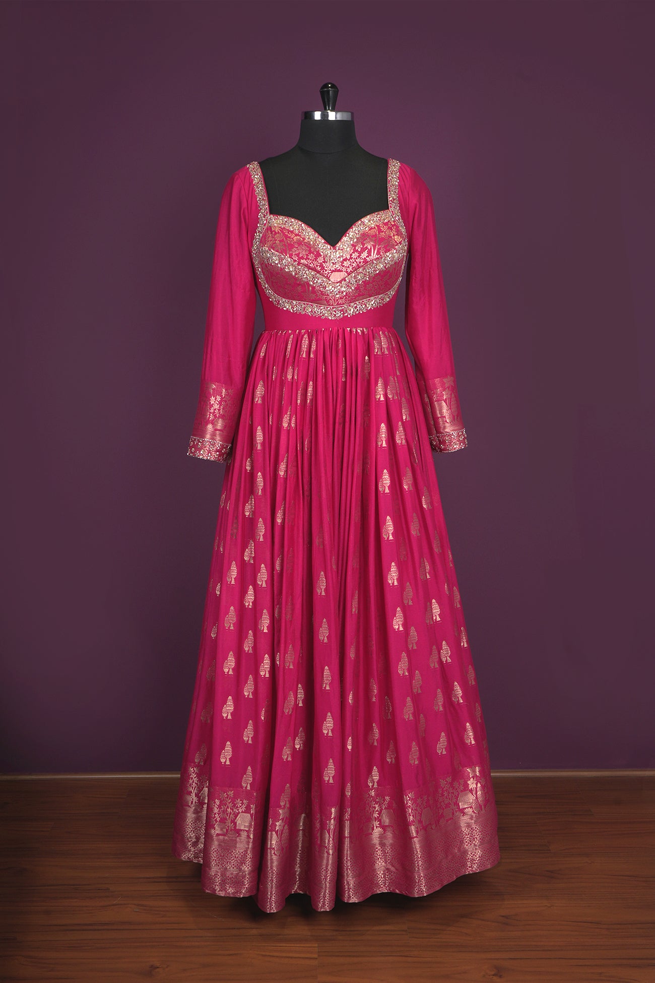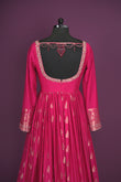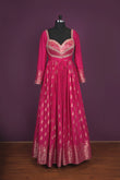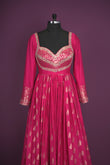 Festive wear traditional fuschia pink single color blended silk woven body designed border hand embroidery Anarkali top with sequins half fine zari gold jari