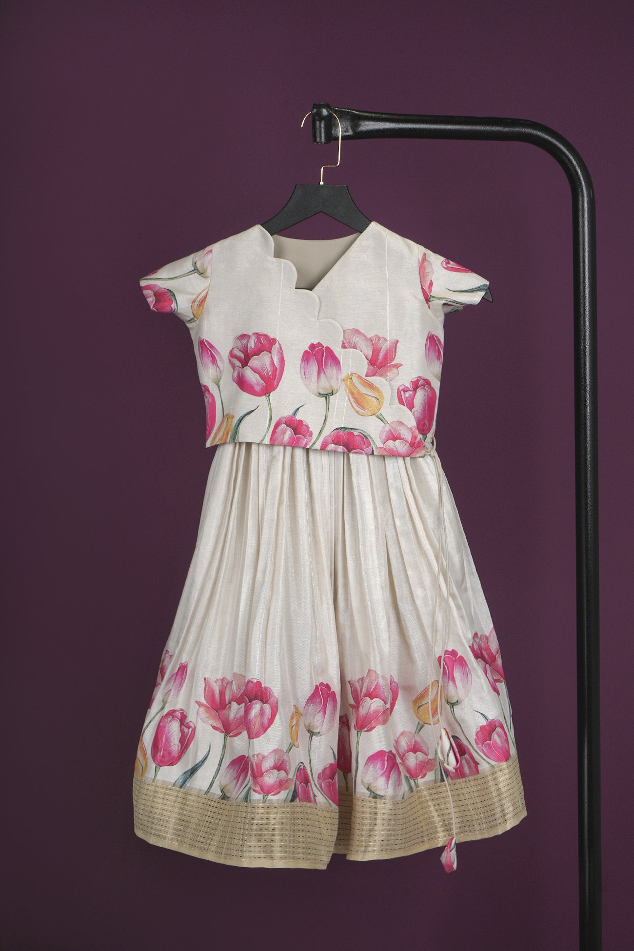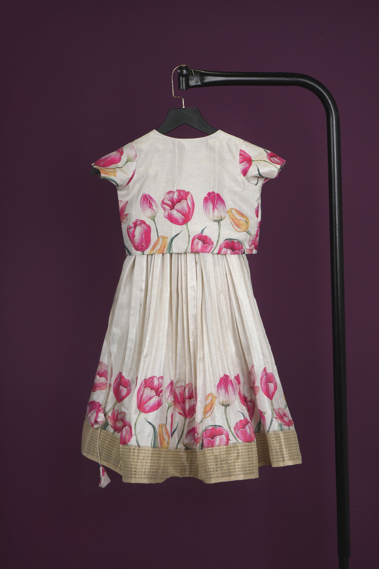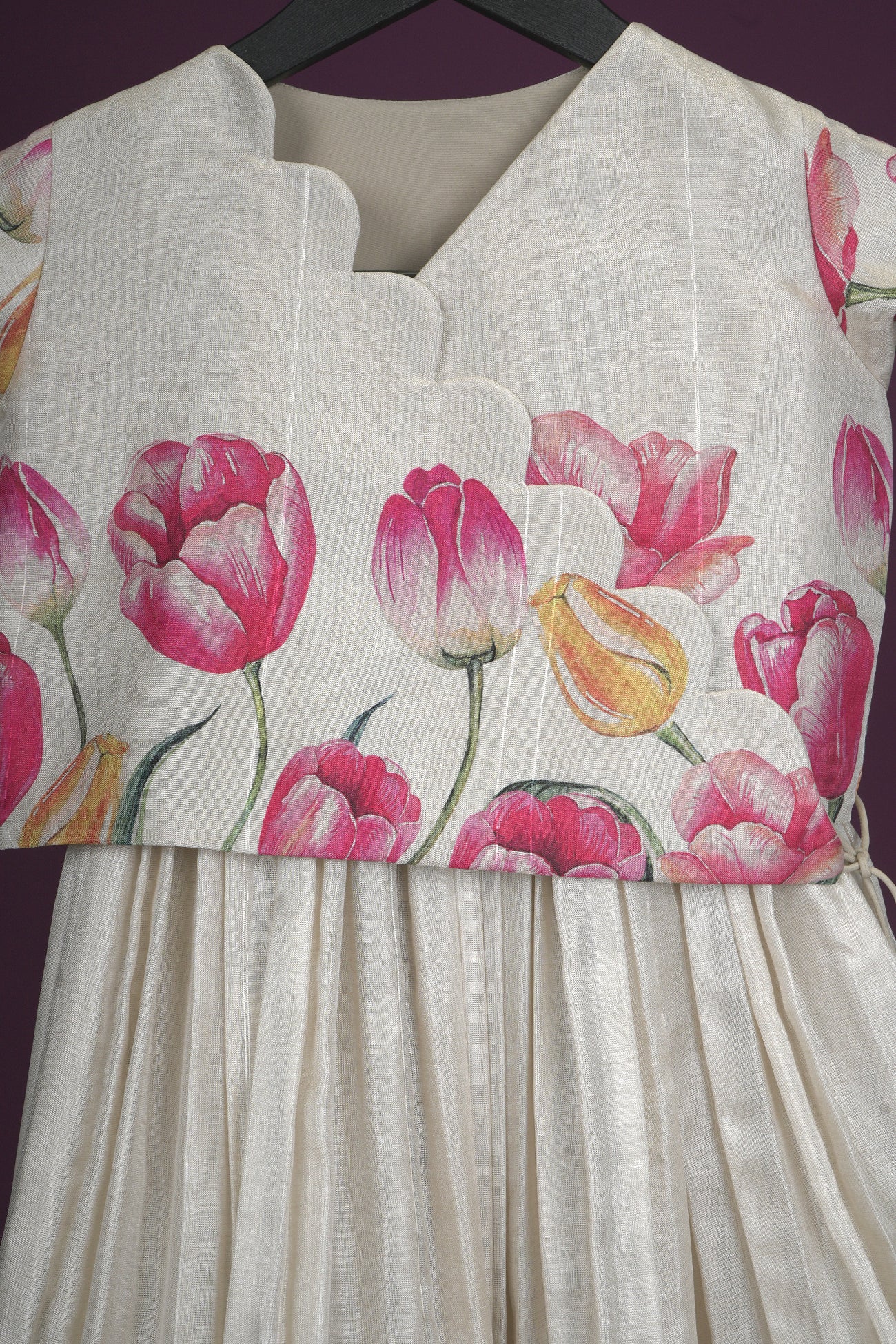 Festive wear traditional light beige single color blended tussar body designed border printed Lehanga blouse with out dupatta