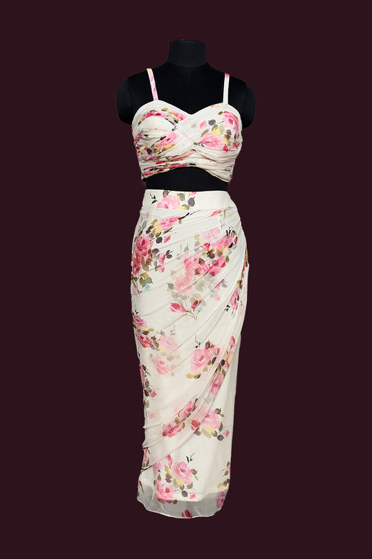 Party wear pretty white single color blended chiffon wrinkled body designed printed Indo-westerns