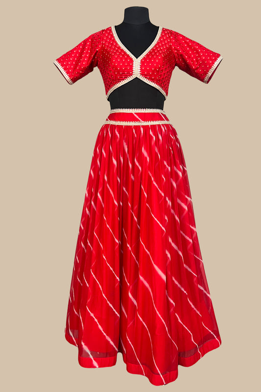 Festive wear pretty blood red single color blended chiffon satin body designed printed lehenga with...