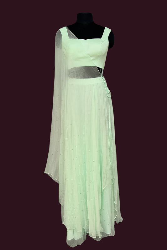 Festive wear pretty cool mint sea green single color blended chiffon crepe body designed hand...