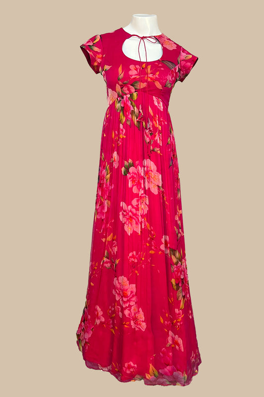Festive wear pretty fuschia pink single color blended chiffon wrinkled floral body designed printed gown