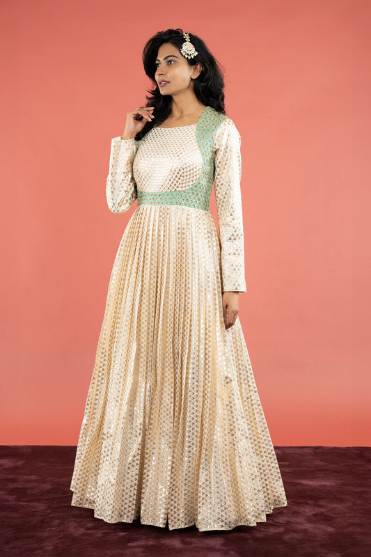 Festive wear pretty natural beige tussar single color blended tissue woven body designed border anarkali...