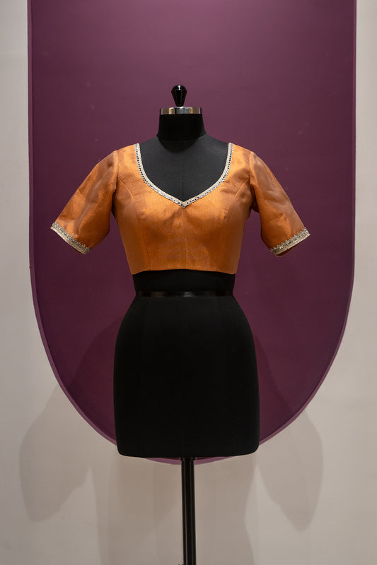 Festive wear pretty chestnut rust single color blended tissue shiny body designed hand embroidery blouse...