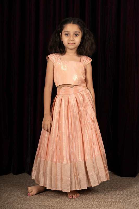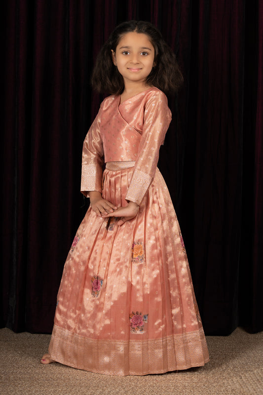 Festive wear pretty salmon pink single color blended organza tissue woven body designed border Girls...