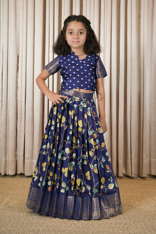 Festive wear pretty navy blue single color blended dupion body designed border printed Girls Lehanga...