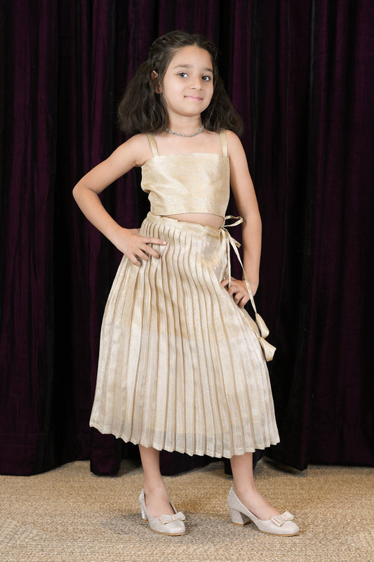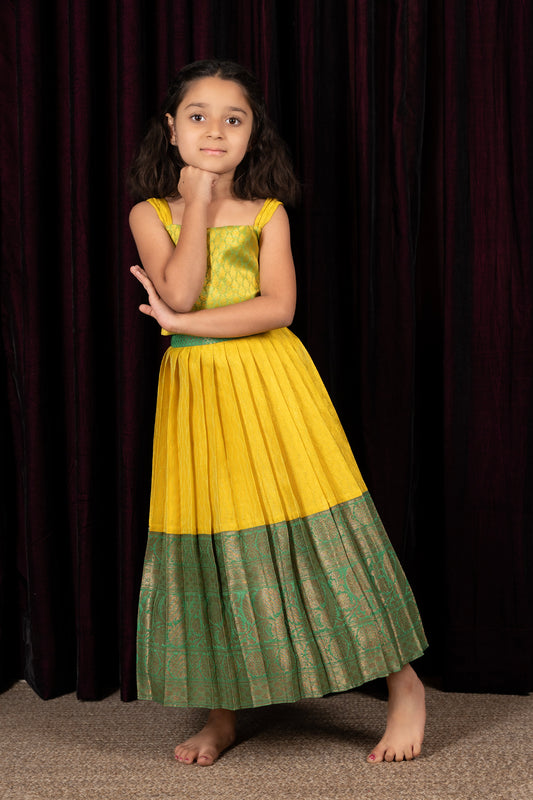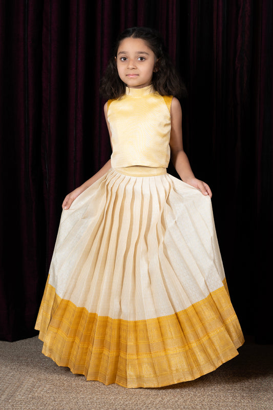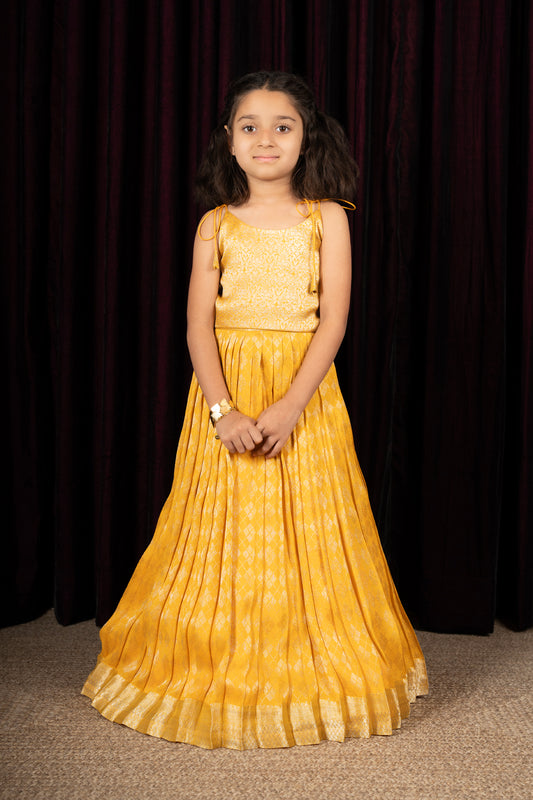 Festive wear pretty golden yellow single color blended georgette brocade body designed border Girls Lehanga...