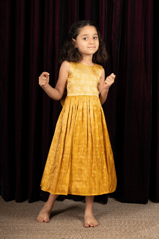 Festive wear pretty golden yellow single color blended tussar shiny body designed gown with half...