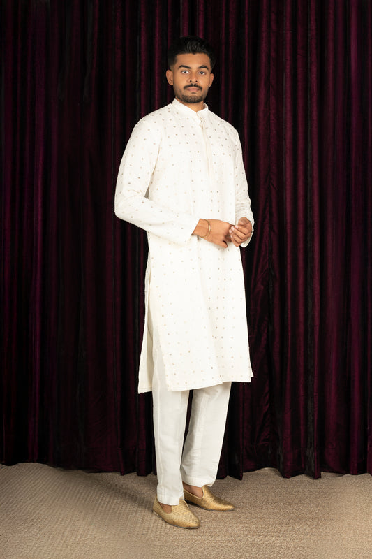 Festive wear pretty white single color blended cotton linen body designed hand embroidery Kurta set