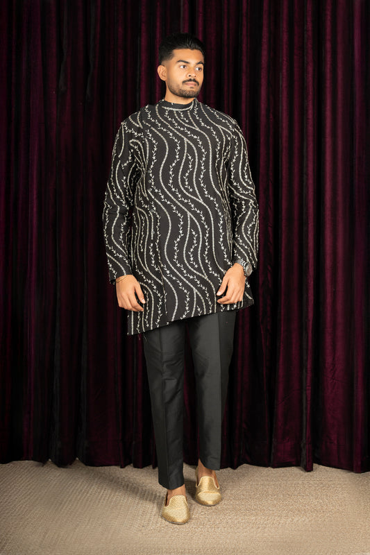 Festive wear pretty black single color blended cotton linen body designed machine and hand embroidery...