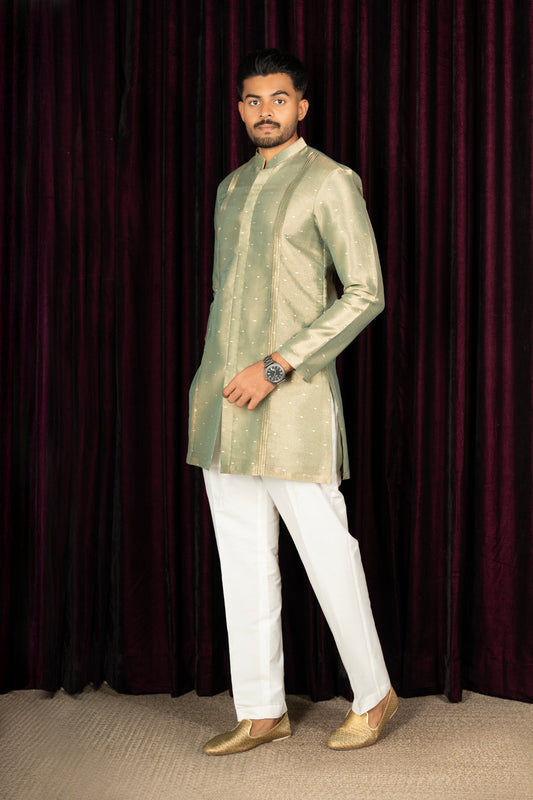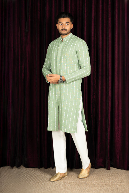 Festive wear pretty pistachio green single color blended tissue woven body designed Kurta ready to...