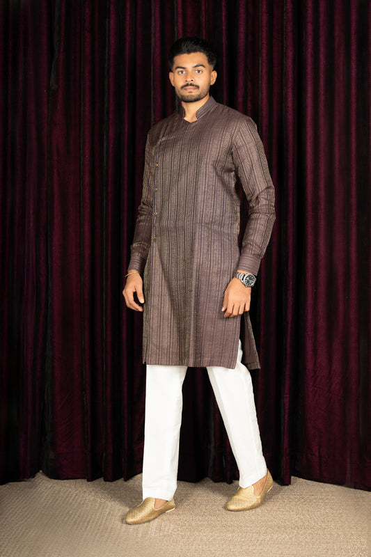 Festive wear pretty chocolate brown single color blended tussar woven body designed hand embroidery thread...