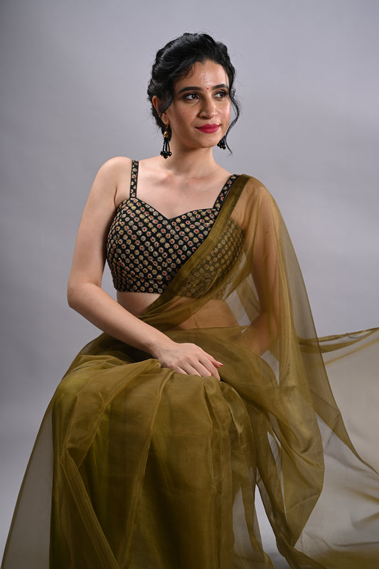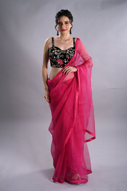 Party wear pretty single color blended organza crisp body designed border hand embroidery saree with...