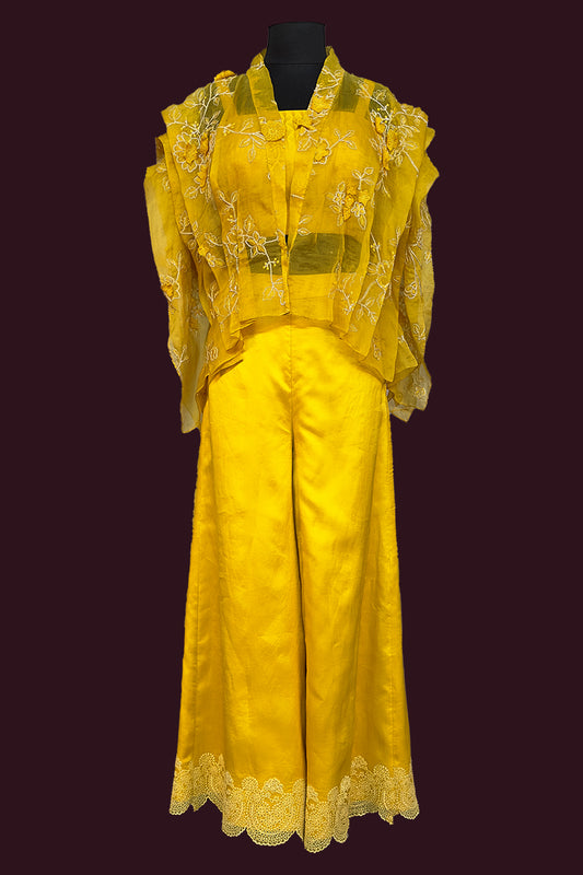Festive Party wear pretty golden yellow single color blended organza satin crisp body designed machine...
