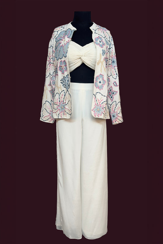 Party wear pretty white single color blended chiffon wrinkled body designed printed Indo-westerns